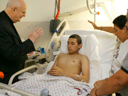 Pvt. Adrian Garcia of El Paso, Texas, was with his parents in his hospital room when the priest dropped in. Mr. Garcia lost both legs above the knees because of an IED. Father Kenny murmured a blessing to both Garcia and his parents.