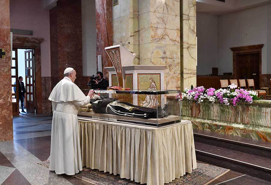 Standing in front of an iconic image of a young Padre Pio bearing the wounds of Christ’s crucifixion in his hands, the pope said that it was in Pietrelcina that the future saint “strengthened his own humanity, where he learned to pray and recognize in the poor the flesh of Christ.”