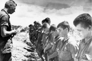 In a biography written by Father Daniel Mode titled “The Grunt Padre” – Father Capodanno’s nickname – Marine Cpl. Keith Rounseville recounts how Father Capodanno “was jumping over my (fox) hole, all the while exposing himself to enemy machine gun fire to try and give aid to a wounded Marine.”