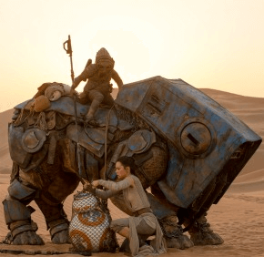 Meanwhile, our scrappy scavenger, the clever and resourceful Rey (Daisy Ridley) picks up Poe’s BB-8 rolling robot. The BB unit contains a piece of a crucial map that will assist the Republic, and foil the First Order’s plans to find and recruit for the dark side the legendary Luke Skywalker, who disappeared after the battle with the Empire and the death of his father, Darth Vader.