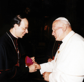 Years ago, while serving as Cardinal James A. Hickey’s priest-secretary in the Archdiocese of Washington, I had the privilege of joining a small number of priests who concelebrated an early morning Mass in Pope John Paul II’s private chapel. Afterward, the Holy Father greeted each of us as our picture was taken. Of all the photos I had with John Paul II over the years, this one is my favorite: The pope put his hand on my shoulder and smiled at me, the way a proud father smiles at his son. It was a moment when I personally experienced the spiritual fatherhood of John Paul II.