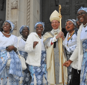 Ruth Vinga, a parishioner of St. Gabriel in Woodlawn who is originally from Cameroon, joined a group of women dressed in bright skirts featuring the image of Mary as they gathered around the archbishop at the end of Mass. They sang and danced as the archbishop laughed with them. Vinga said she was excited to participate in the Mass because the archdiocese has accepted immigrants from Cameroon and their culture.