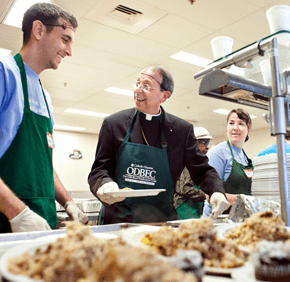 On his first day as archbishop of Baltimore May 17, Archbishop Lori piled plates high with casserole at Our Daily Bread Employment Center.