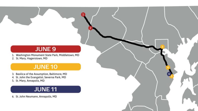 Join us for a procession in the City of Baltimore, beginning at the Basilica and traveling near Baltimore’s Washington Monument, the cornerstone for which was laid on July 4, 1815. Built on what was once the wooded grounds of Revolutionary War hero John Eager Howard’s estate, the monument was designed by architect Robert Mills, who would go on to design the famed obelisk in Washington, D.C. Street parking, while available, is limited and requires meter payment; credit cards are accepted. Parking is also available in the public garage at 15 W. Franklin Street, Baltimore, MD 21201. Remember to bring water and good shoes; sidewalks in Baltimore can be uneven.
