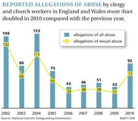 Allegations of sexual and physical abuse against priests, religious men and women, church employees, volunteers and parishioners more than doubled in 2010 compared with the previous year, according to figures released July 28 in the 2010-11 annual report of the National Catholic Safeguarding Commission.