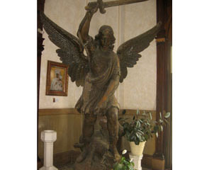 Carved by Joseph Sudsberg, the nearly 12-feet-tall statue portrays the winged St. Michael wielding a sword.
