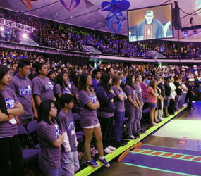During a mid-morning liturgy in the arena, Los Angeles Cardinal Roger M. Mahony commended students Samantha Perez and Daniel Rafferty, who shared their stories about finding God in the midst of their sufferings.