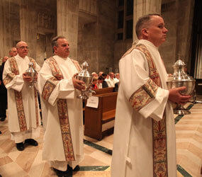 During the solemn liturgy, Archbishop O’Brien followed ancient tradition by consecrating the chrism oil and blessing other oils that clergy will use in their ministry.
