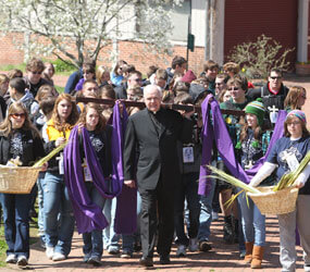 After a rally at St. Mary’s Spiritual Center, the large group split into two. One went to the Basilica of the National Shrine of the Assumption of the Blessed Virgin Mary for the adoration of the Blessed Sacrament, while the other went to St. Jude Shrine for music by the bilingual group “Who Do You Say I Am.” The two groups switched sites before meeting at War Memorial Park. They then processed, with palms in hand, to O’Donnell Park in Canton for a blessing. Finally, all 1,400 pilgrims moved next door for a Mass celebrated by Archbishop O’Brien at St. Casimir.
