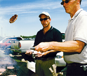 Half-pound burgers often become quarter-pounders or sliders at a Laverick tailgate. Baked chips can replace standard potato or tortilla chips on tables.