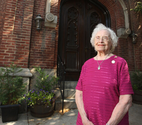 On a sunny mid-June afternoon, Zepp sat in Holy Cross’ rectory wearing a red sweater adorned with two pins. One was of an angel and the other recognized her upcoming 90th birthday on July 12.