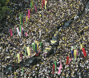 Outside, hundreds of thousands of citizens watched the interfaith funeral on large screens, bringing with them yellow ribbons, balloons and paper caps. Yellow was Roh’s symbolic color.