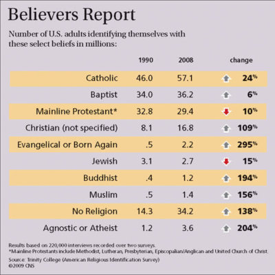 Trinity College of Hartford, Conn., released its third American Religious Identification Survey March 9. The survey also found that the U.S. Catholic population has shifted away from the Northeast toward the Southwest, the percentage of Latinos in the U.S. Catholic Church has grown and the number of U.S. residents claiming no religion has increased dramatically.