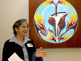 St. Agnes Hospital, Baltimore, now features two stained glass light boxes in their new entrance, based on the mandala prayer drawings by former art therapist and Daughter of Charity Sister Ellen LaCapria, who regularly uses mandala in her prayer.