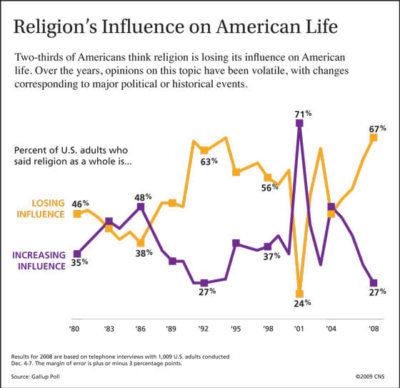The high point for those who said religion was increasing its influence came in December 2001, three months after the Sept. 11 terrorist attacks in New York, Washington and Pennsylvania, when 71 percent of Americans saw a rise in religion’s influence.