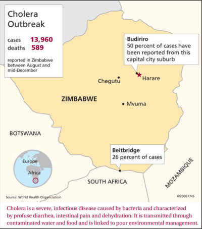 Zimbabwe’s cholera epidemic is made worse by its economic crisis. Inflation is officially 231 million percent, but prices double every 24 hours. Basic foodstuffs are running out, and the flow of refugees has spread the cholera to Mozambique, Botswana and Zambia, in addition to South Africa.