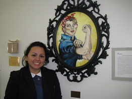One real Rosie, Camille Grant, brought a welding mask and iron which she had saved over the years, and wore the typical work uniform of pants and shirt. A bandana was tied around her head as in the famous Rosie the Riveter illustration.