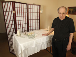 Most living rooms hold the typical décor: couch, reclining chair, television, table and credenza. Father E. Gerard Huesman’s modest apartment in Timonium contains all that, plus one additional fixture – an altar.