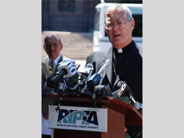 Bishop Thomas J. Tobin of Providence and Alfred J. Moscola, general manager of the transit authority, known as RIPTA, announced the launch of the Catholic Charity Fund RIPTIKS program June 11 on the steps of the Cathedral of Sts. Peter and Paul.