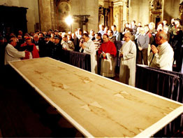 At the end of the Vatican audience, the spokesman for the shroud’s custodian, Monsignor Giuseppe Ghiberti, presented the pope with a life-size reproduction of the shroud.