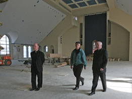 Pointing to large Stations of the Cross hanging from the walls of the new church, Monsignor John Dietzenbach, pastor of St. Peter, told the archbishop the cherished religious artwork was recovered and restored after the fire. Pieces of stained glass broken in the fire will also be incorporated into a special window in a perpetual adoration chapel in the new church, Monsignor Dietzenbach said.
