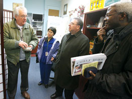 Monsignor Novatus Rugambwa, undersecretary in Rome for the Pontifical Council for Pastoral Care of Migrants and Itinerant People; Father Allan Figueroa Deck, S.J., executive director of the Secretariat of Cultural Diversity in the Church for the U.S. Conference of Catholic Bishops; and Sister Myrna Tordillo, M.S.C.S., program specialist of the same, were listening to Monsignor FitzGerald’s description of the AOS ministry in Baltimore, when the seafarers walked in, fresh off a merchant ship, on their way to Best Buy and Wal-Mart.