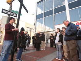 Archbishop Edwin F. O’Brien led the prayers, using a bullhorn to lift his voice above the occasional din of passing busses, trains and early-morning traffic clicking over light-rail tracks.