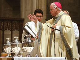 Archbishop Edwin F. O’Brien oversaw the ancient tradition of consecrating the chrism oils that will be used in all archdiocesan parishes throughout the church year to anoint the newly baptized, to seal the candidates for confirmation and to anoint the hands of priests and the heads of bishops at their ordination.