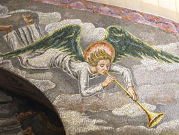 Hildreth Meiere was a 20th-century artist whose work included Byzantine mosaics, art deco medallions and bas-reliefs; she died in 1961. The seminary mosaic, commissioned in 1943, is set in the chapel adjoining the crypt, where bishops of Rockville Centre and Brooklyn are buried. It depicts Jesus seated on the throne of earth on Judgment Day.