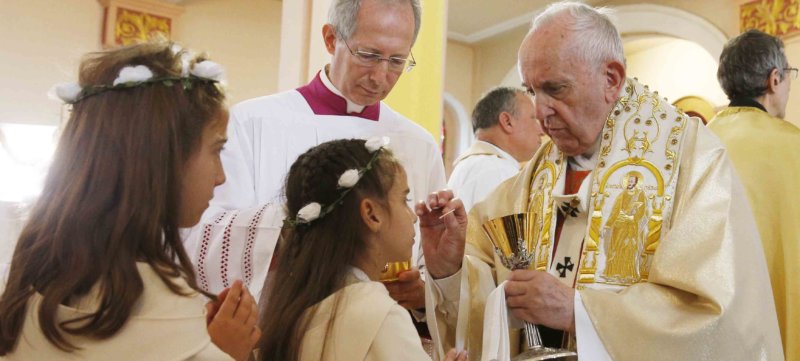 The Vatican press office said it was the first time on a papal trip that Pope Francis had administered first Communion.