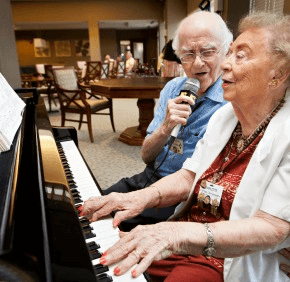 When Langbehn sings, he’s often accompanied on piano by his wife, Charlotte Clem-Langbehn, 90. A Protestant, Clem-Langbehn attended Catholic schools in Frederick, where she learned piano from the School Sisters of Notre Dame. She and Langbehn, both widowed, met at their retirement community and married in 2004. The duo performs a “Musical Moments” act at resident dinners.