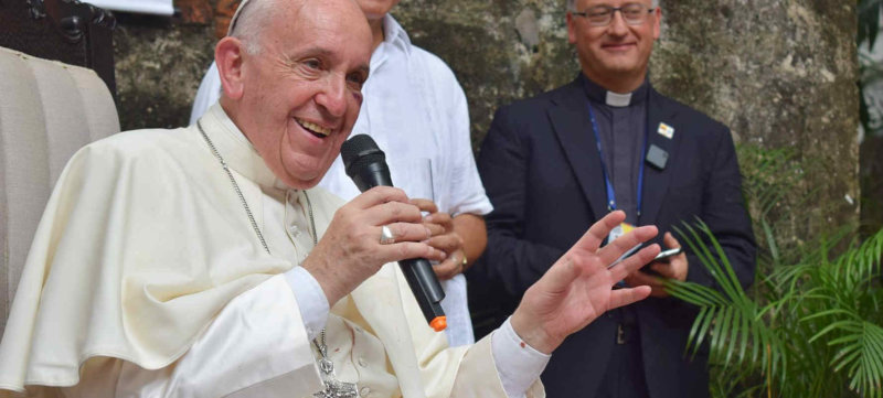 Meeting privately with a group of Jesuits and laypeople associated with Jesuit-run institutions in Colombia, the pope told them, “I am here for you,” not to make a speech, but to hear their questions or comments.