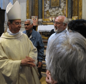 While St. Peter’s Basilica can accommodate 30 Masses simultaneously, things were a little quieter the morning of April 25 at Santa Maria in Trastevere (St. Mary’s Across the Tiber), where Archbishop William E. Lori visited with pilgrims from Baltimore as they waited their turn in the chapel.