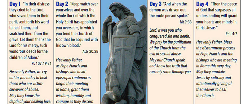 Each day of the prescribed novena includes a reading from Scripture and a unique prayer for the intentions of victim-survivors, bishops, priests and seminarians, and for strengthening the church. Every recitation concludes with an Our Father, a Hail Mary, a Glory Be and a prayer to St. Michael the Archangel, defender of the church.