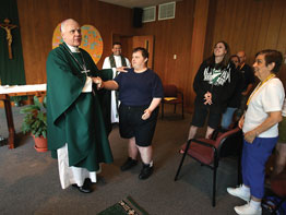 During his homily, Archbishop O’Brien walked to the front of the room, standing inches from his audience of about 50 campers and volunteers, and engaged them in a conversation.