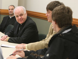 Following his talk, Archbishop O’Brien sat in on one of several small-group discussions. The students told him how nine of them traveled to Browning, Mont., in February to volunteer as tutors at a school located on a reservation for the Blackfeet Tribe. The school is sponsored by the Christian Brothers, the same religious community that runs Calvert Hall.