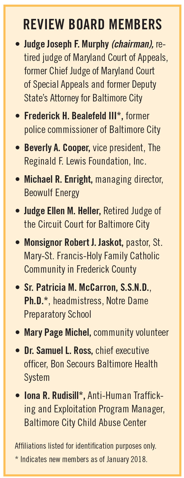 Judge Joseph F. Murphy, who retired from the appellate courts in Maryland in 2011, currently chairs the Review Board. Before he joined the board in 2012, he was not aware of the diversity of the group, which includes people of other faiths and people from various ethnic and minority communities. “I really applaud people who, when they started out putting the board together, recognized the strength and the importance of this kind of professional, personal, political and religious diversity,” he said.