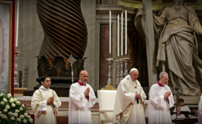 Processing into the basilica dressed in white, the symbol of purity, Pope Francis made his way to a replica of St. Juan Diego's tilma, which bears the image of Mary, who appeared to the indigenous saint in 1531.Read More
