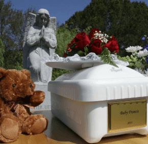 A tiny white casket, with “Baby Francis 2015” inscribed on a gold plaque affixed to one end, and flanked by flowers and a small teddy bear, rested upon a portable pine altar as the burial service was conducted under a brilliant blue sky.