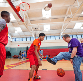 Calvert Hall and Loyola Blakefield can be the bitterest of rivals, but players from the two schools teamed up the afternoon of Feb. 17 to share basketball, fellowship and pizza with residents of Gallagher Services, which serves adults with intellectual disabilities.