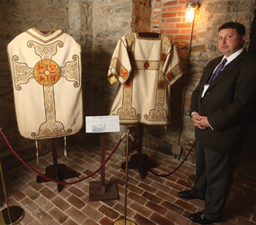 A red-buttoned black cassock believed to have belonged to Cardinal Lawrence Shehan is another item on display, along with vestments with colorful hand-painted flowers.