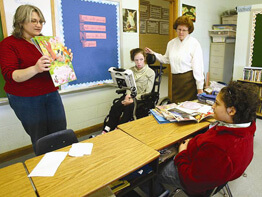 An aide keeps John focused in a mainstream religious education class, as are three other children – one deaf – in different grades. Down the hall, Katie Mason, 17; Allissia Kelley, 14; and Maggie Breschi, 16, form a class of their own. One girl has Down syndrome, one is extreme bipolar and the third has multiple physical disabilities and uses a wheelchair.