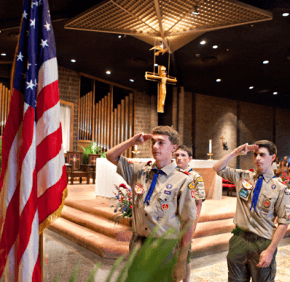 Before the Mass, Boy Scouts carried the American and Papal flags to the front of the church and led the congregation in the pledge and Star Spangled Banner.