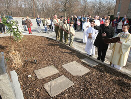 The 15-minute walk ended at St. Joseph in Fullerton, where Bishop Rozanski rededicated a monument to the unborn that was recently relocated to a more prominent location near the parish cemetery.