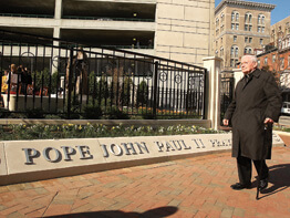 As construction workers arranged yellow fall annuals and wiped down a wrought-iron fence at the Pope John Paul II Prayer Garden, Cardinal William H. Keeler surprised them.
