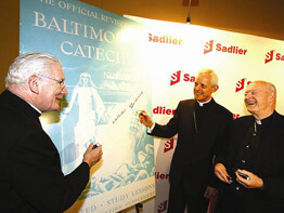 In a nod to the historic significance of the Baltimore Catechism, Cardinal Keeler joined Cardinal Theodore McCarrick, retired archbishop of Washington, D.C.; and Archbishop Donald Wuerl of Washington, D.C. in signing two large cover reproductions of early editions of the text April 11.
