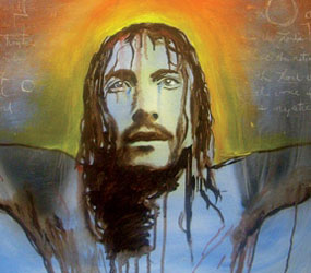 One of D’Adamo’s favorite and most compelling works is called “Surrender.” It started out as a depiction of God over the water, but when the artist made a mistake it led to a reimaging of the artwork into a painting of Christ with outstretched arms on the cross. The image was inspired from the 1977 film “Jesus of Nazareth.” D’Adamo used nails to scratch Scripture passages into a brilliant fire color in the background.