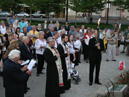 People gathered May 29 at War Memorial Plaza in Baltimore to commemorate the 75th anniversary of the “holodomor,” or Ukrainian genocide of 1932-33. Father Vasyl Sivinskyi, pastor of St. Michael Ukrainian Catholic Church in Baltimore, and Father Vasyl Kryshtompol, a Ukrainian Orthodox priest in Baltimore, lead a prayer service. A torch from Ukraine was used during the prayer service.