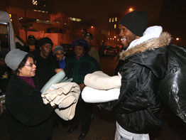 With the support of the other parishioners who had disembarked from the bus, Ms. Sorgho began distributing blankets to the homeless men and women who eagerly lined up to accept their gifts of warmth.