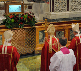 Before beginning the evening prayer service, Pope Benedict descended the steps at the foot of the basilica’s main altar and prayed before a small window that allows the public to see a portion of the sarcophagus.